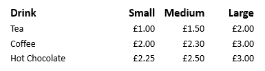 Question 2: A board in a café shows the following prices.