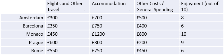 Question 3: A couple are comparing European holiday destinations and their various costs. They are looking to go on the cheapest holiday possible.