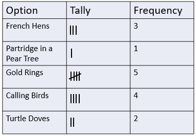 We can now input a frequency column to turn this Tally Chart into a Frequency Table. Here, we count the number of strikes in the chart for each option, and convert this into a numerical value. This allows us to work with data much more quickly. Take the last example: