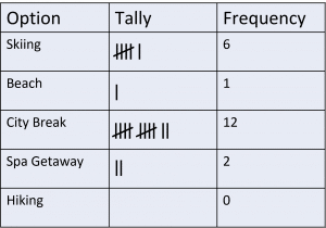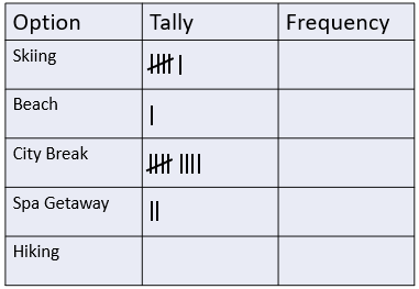 Tally Charts are used to record results “on-the-fly”. They’re most commonly used in surveys, questionnaires and general data collection, and are particularly useful for situations where results are being recorded manually.