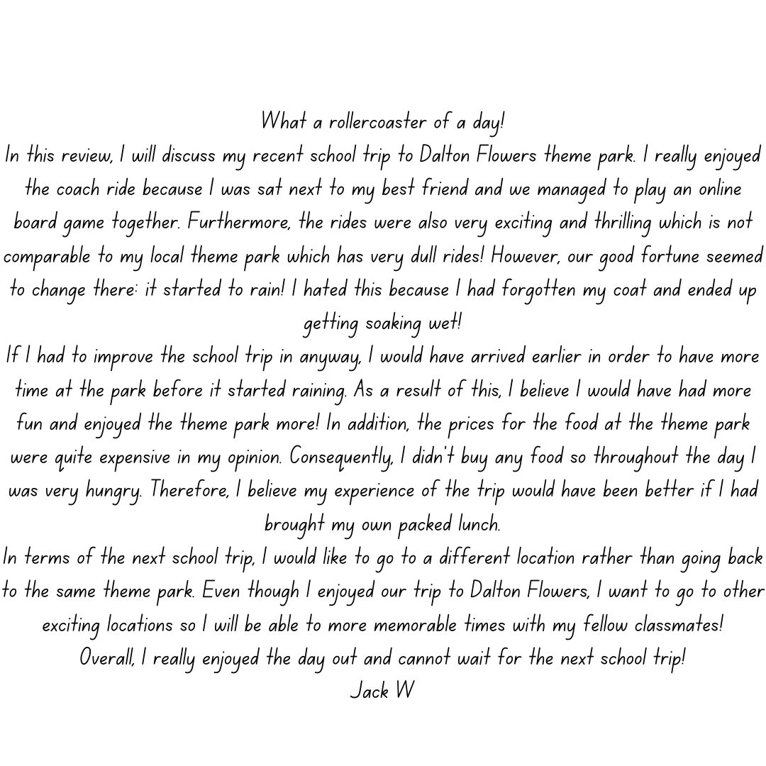 ”You recently went on a school trip to a theme park. The head of year has asked you to write a review of the day out which will be published in the school newsletter.