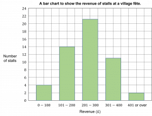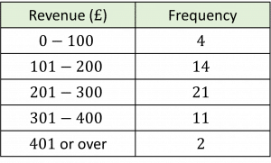 Question 3: At a village fête, the total revenue from all the stalls is recorded, shown in the grouped table below.