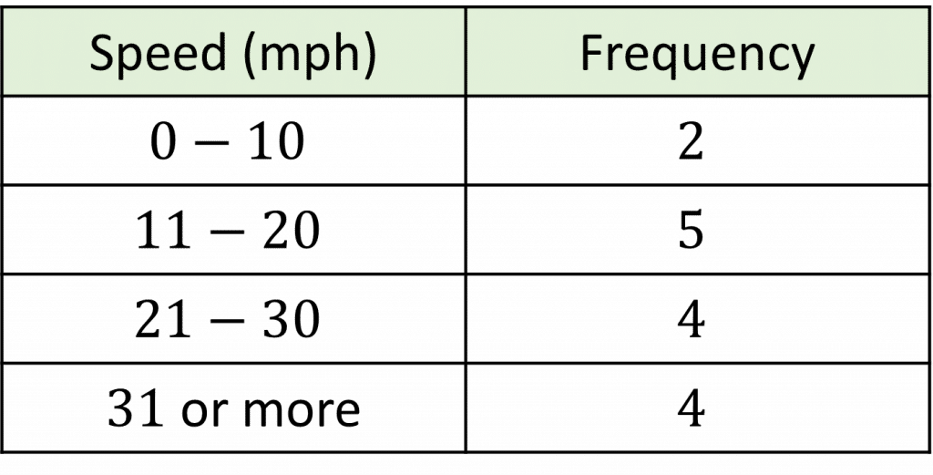 Question 1: Karen records the speeds of cars going past a primary school between the hours of 8am and 10am. Below is a list of the speeds she recorded: