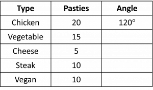 So, we can complete the table, by multiplying the number of pasties in each row by 6\degree: