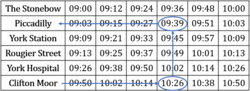Example: Chloe wants to arrive at Clifton Moor by 10:30. She will get on the bus at Piccadilly. At what time does she need to be at Piccadilly bus stop?