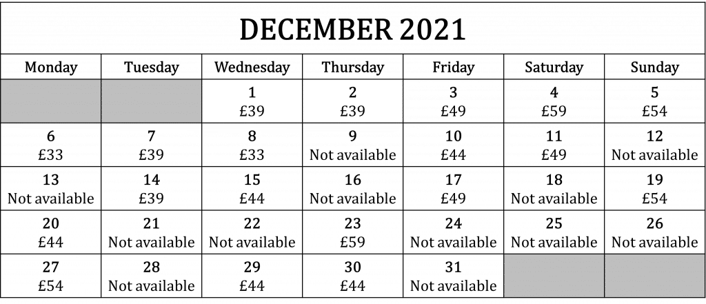 The available weekend days are Saturday 4th December, for £59, Sunday 5th December, for £54, Saturday 11th December, for £49, and Sunday 19th December, for £54.