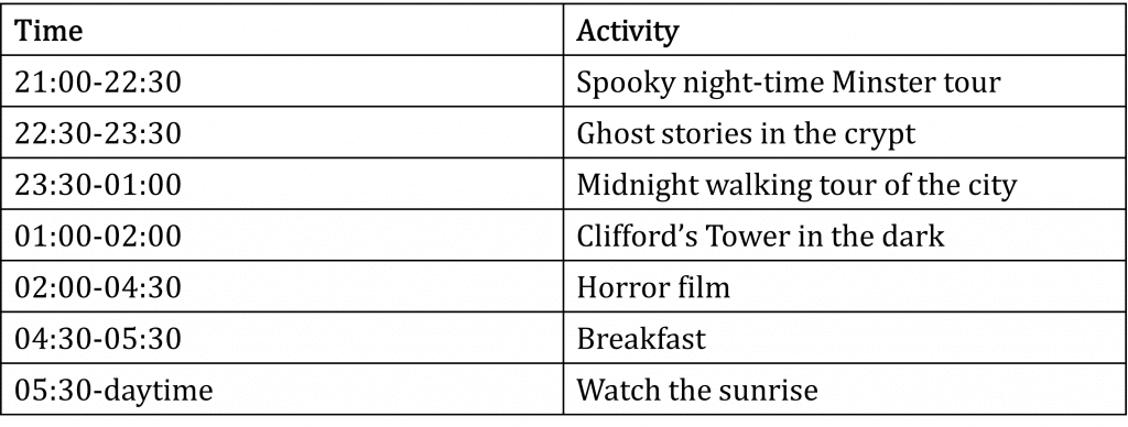 Question 5: Tony has joined the overnight spooky tour of York to take place on Halloween night. He is given the following timetable for it.