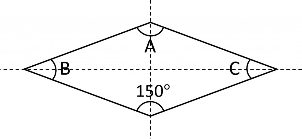 The diagram shows a quadrilateral, with two lines of symmetry. Find the values of angles A, B and C.