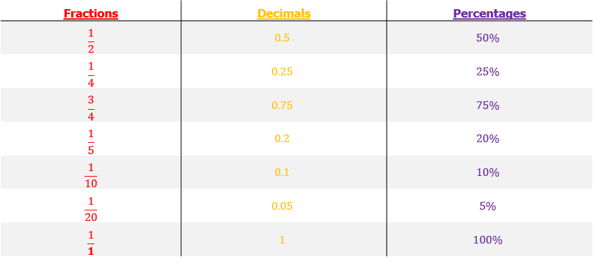 These are some common fractions, decimals and percentages you should remember.