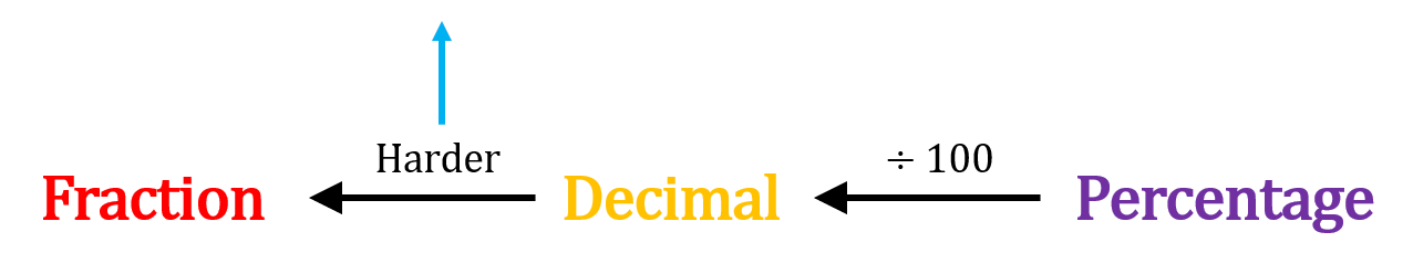 Note: To convert straight from percentages to fractions, write the percentage as a fraction with 100 on the bottom, without the \% sign, and then simplify it