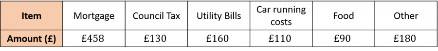 Adding up all her monthly expenditures: £458+£130+£160+£110+£90+£180=\textcolor{orange}{£1128}