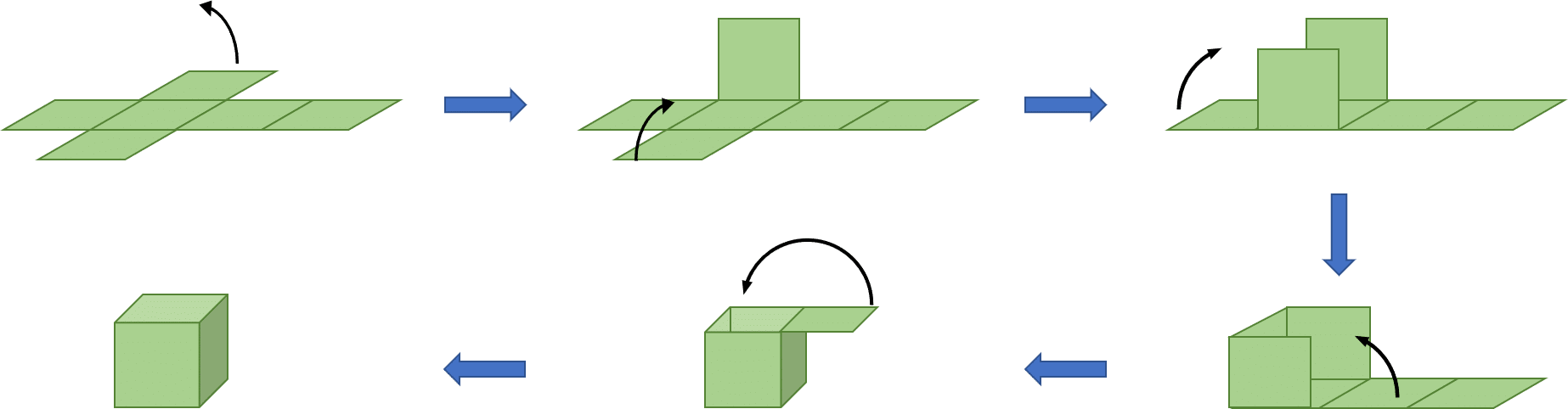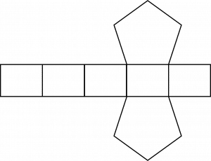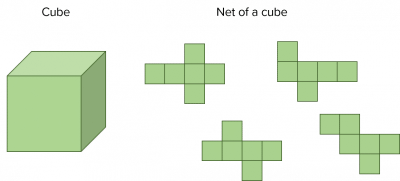A net shows each face of a shape laid out flat. 3D shapes often have several different nets. Below are some examples of nets of a cube (there are many more):