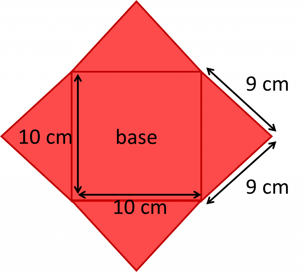 Now, we need to connect the base of the triangle to each side of the square. The other two sides of the triangle are 9 cm, since it is an isosceles triangle.