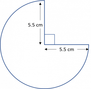 We know that the shape is \dfrac{3}{4} of a circle as the missing segment of the circle has an angle of 90\degree.