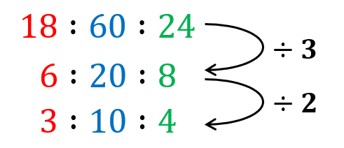 Example: Write the ratio \textcolor{red}{18}:\textcolor{blue}{60}:\textcolor{limegreen}{24} in its simplest form.
