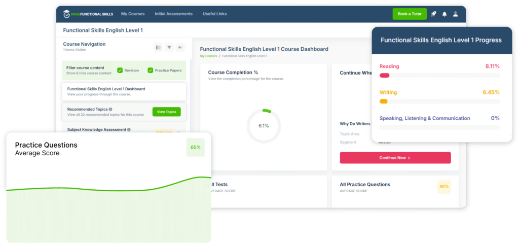 Start with our Functional Skills English Initial Assessment. It’s a quick and simple test that shows your current level. Based on your results, we’ll recommend the best course for you. The test includes different types of questions on key English topics, giving you a clear idea of your strengths and areas to improve.