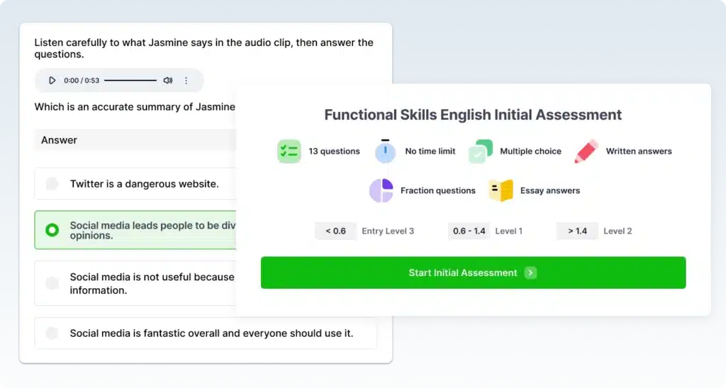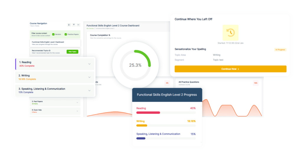 Start with our Functional Skills English Initial Assessment. It’s a quick and easy test that helps determine your current level. Based on your results, we’ll suggest the best course for you to enrol in. The test covers a variety of question types across key English topics, giving you a clear picture of your current abilities.